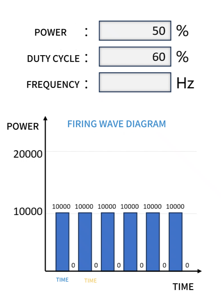 Na podstawie częstotliwości, 60% cykl pracy oznacza, że impuls zaczyna się od 0,00012 sekundy światła (0,0002 sekundy × 60%), po czym następuje 0,00008 sekundy wyłączenia światła (0,0002 sekundy × 40%). To kończy jeden cykl emisji, podczas gdy rozpoczyna się druga emisja, powtarzając się w pętli.